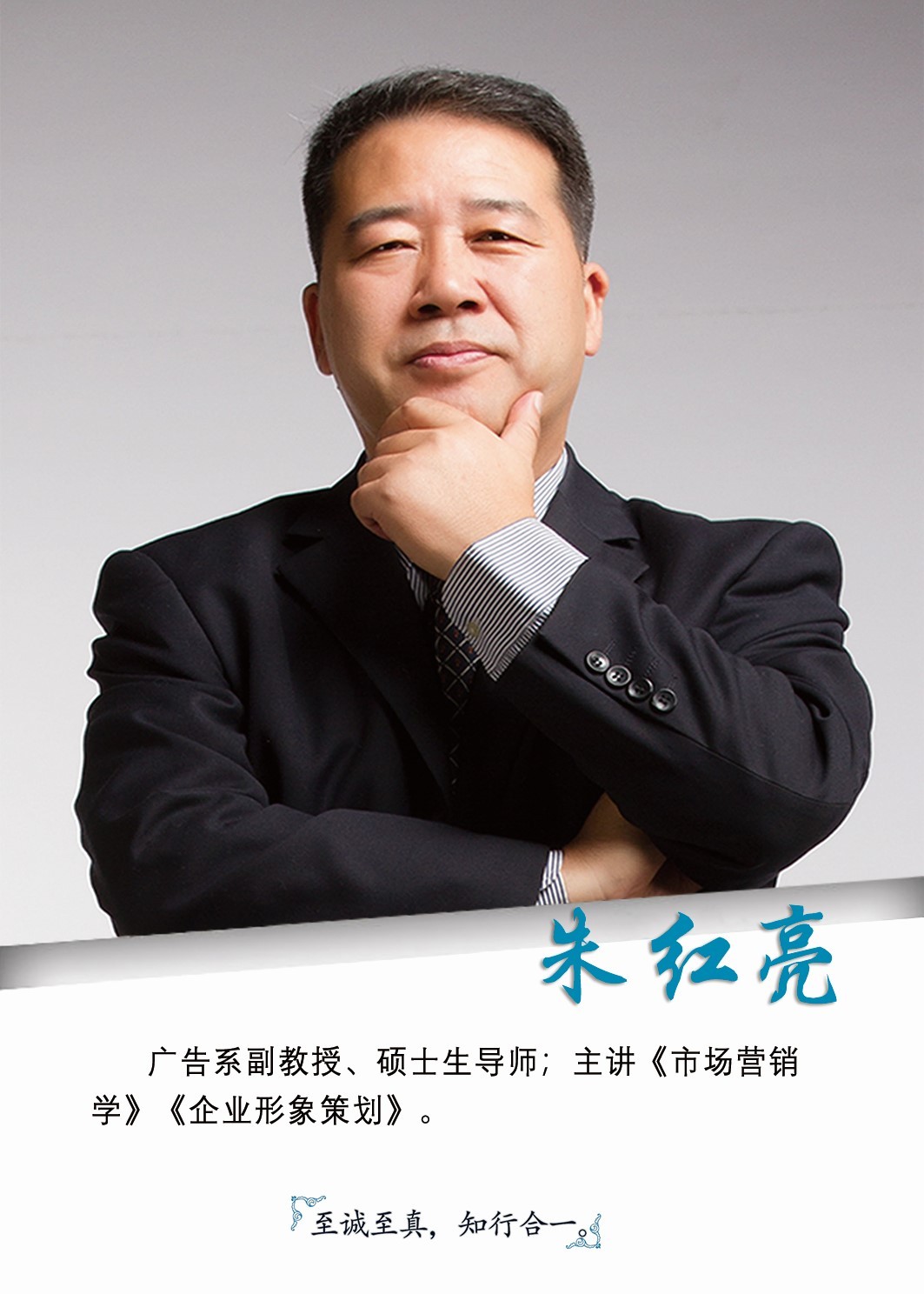 朱红亮,1965年9月,中共党员,硕士研究生导师,副教授,河北省广告研究院副院长,石家庄市委市政府决策咨询委员会委员。长期从事市场营销、企业形象策划、艺术品市场运营与管理的教学和研究工作,研究方向为营销传播。出版教材三部、学术专著4部,发表学术论文20余扁。